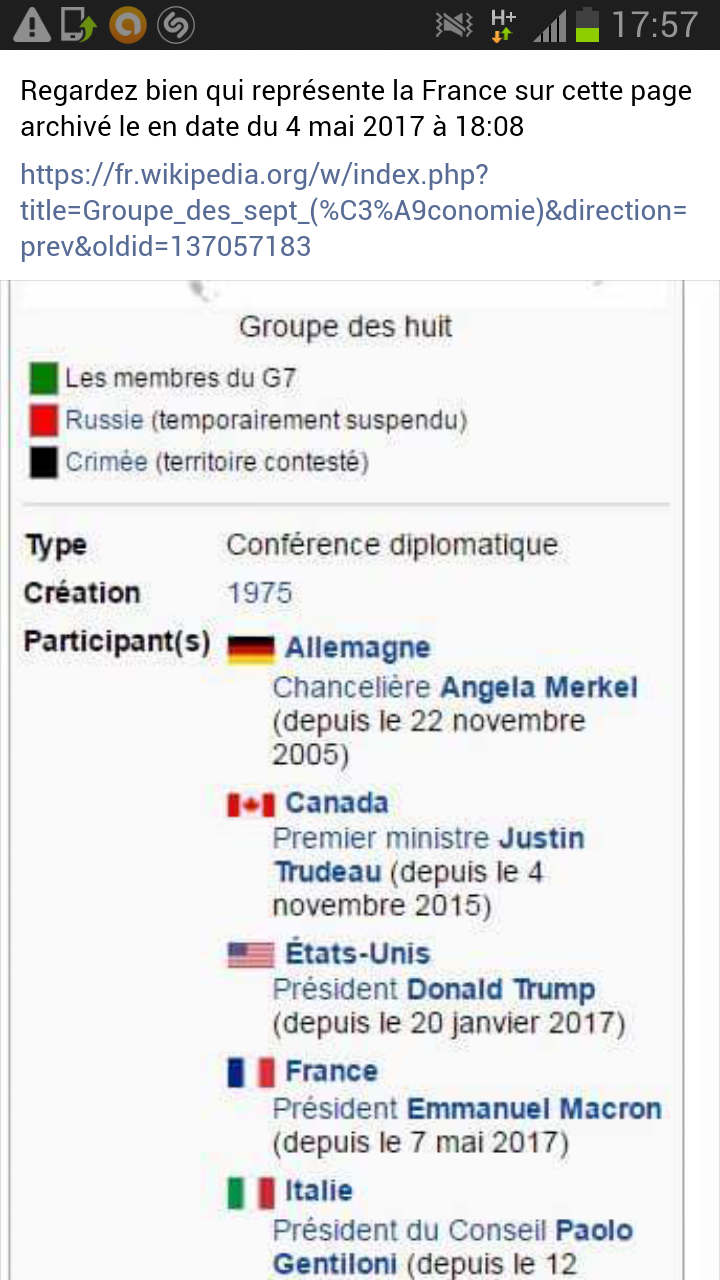 Pour celles et ceux qui doutent que l'élection était jouée d'avance, voici la capture d'écran que j'ai faite le 4 mai à 2017 à 18H08 alors même que les français ne s'étaient pas encore prononcé dans les urnes, Emmanuel Macron est annoncé comme Président de la République le 26 et 27 mai prochain au G8 de Taormina en Sicile.